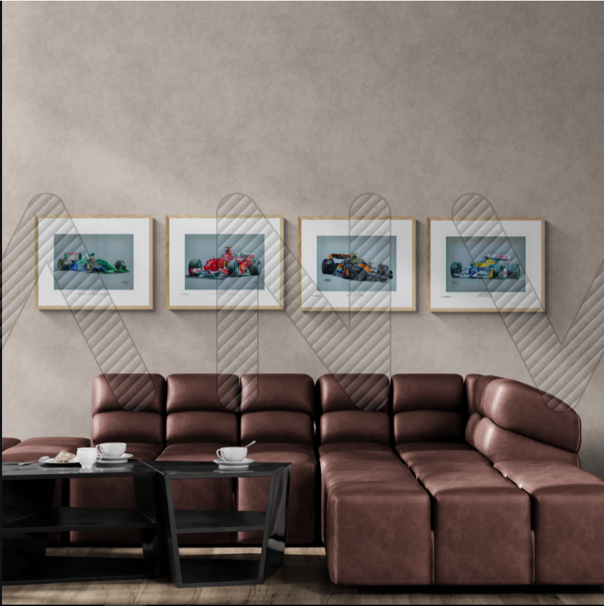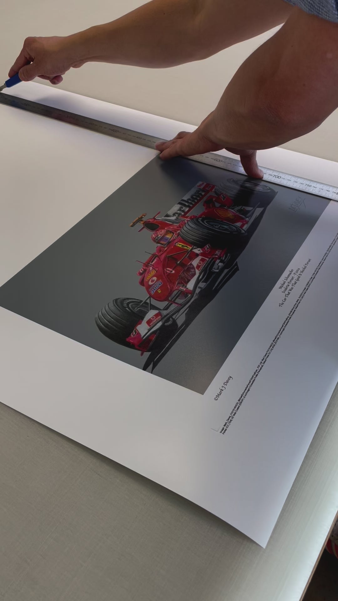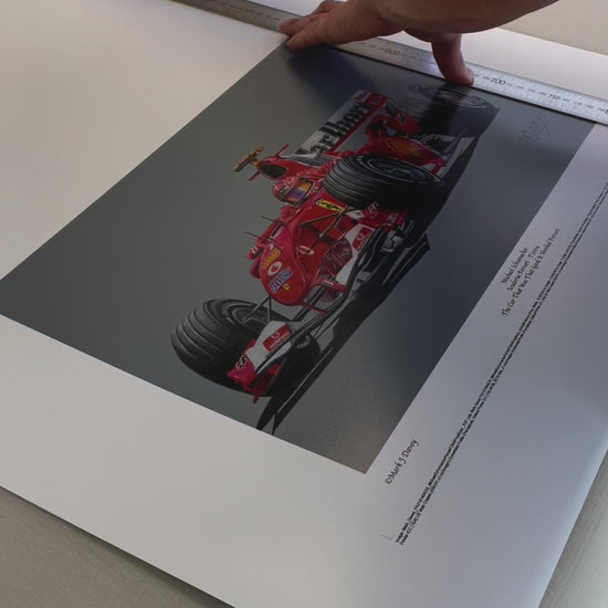 This drawing captures Michael Schumacher driving the unbeatable Ferrari F2004 in which he won his 7th, and final, World Championship. This is a tribute by the artist to the 7-time World Champion at the absolute peak of his powers in F1, celebrating 20 years since the F2004 carried the Regenmeister to the top of the motorsport world.